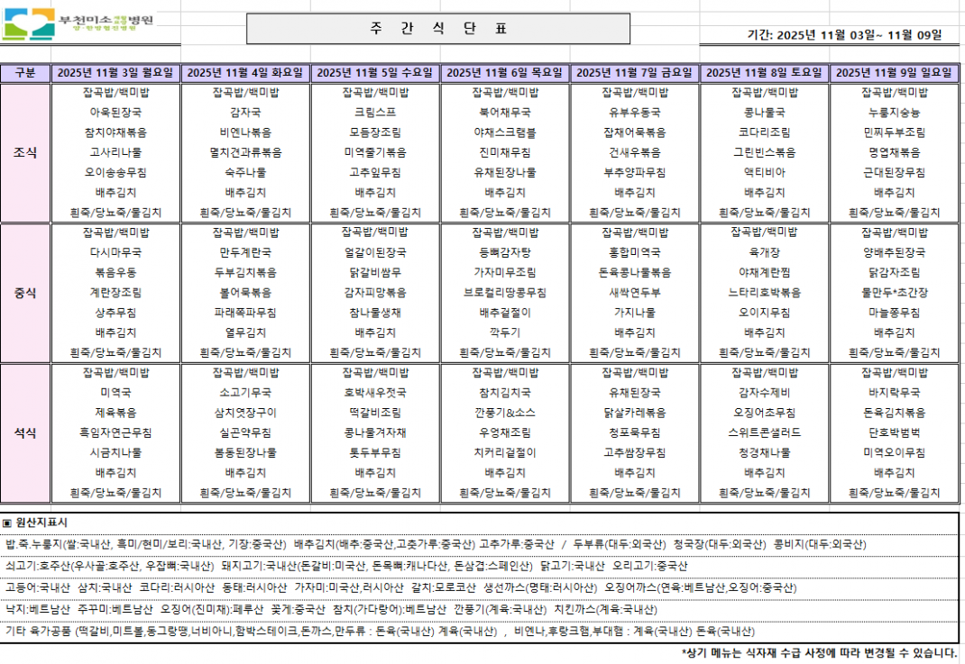 식단표 페이지 정보 작성자 관리자 댓글 0건 조회 45회 작성일 25-11-03 07:30 본문 목록 다음글상두대 옮기는 과정 ♥ 25.07.21 댓글목록 댓글목록 등록된 댓글이 없습니다.